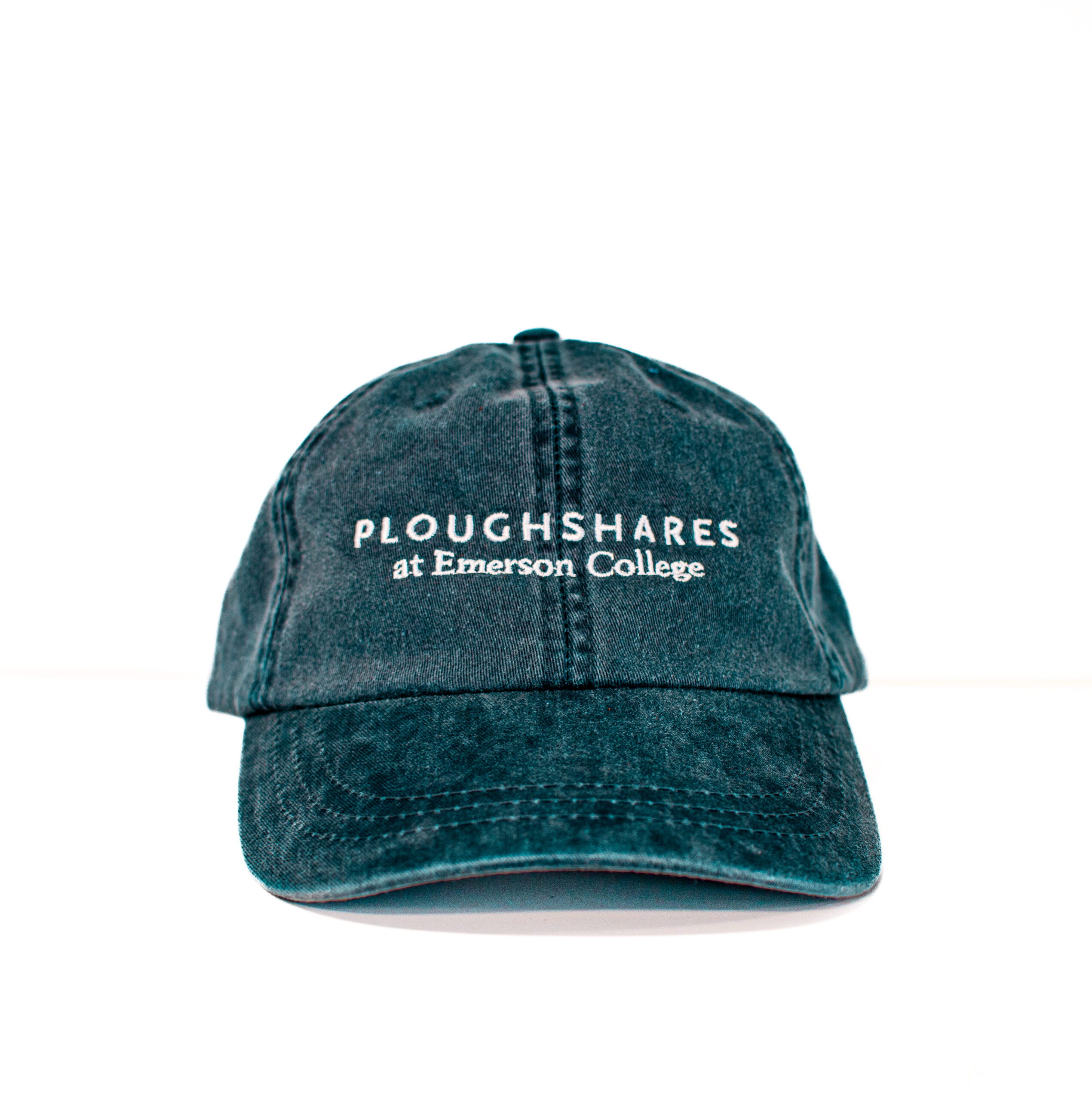 Ploughshares garment-dyed hat with a leather strap and buckle enclosure. Blue with white embroidery. Embroidered locally by Emulsion Printhouse.