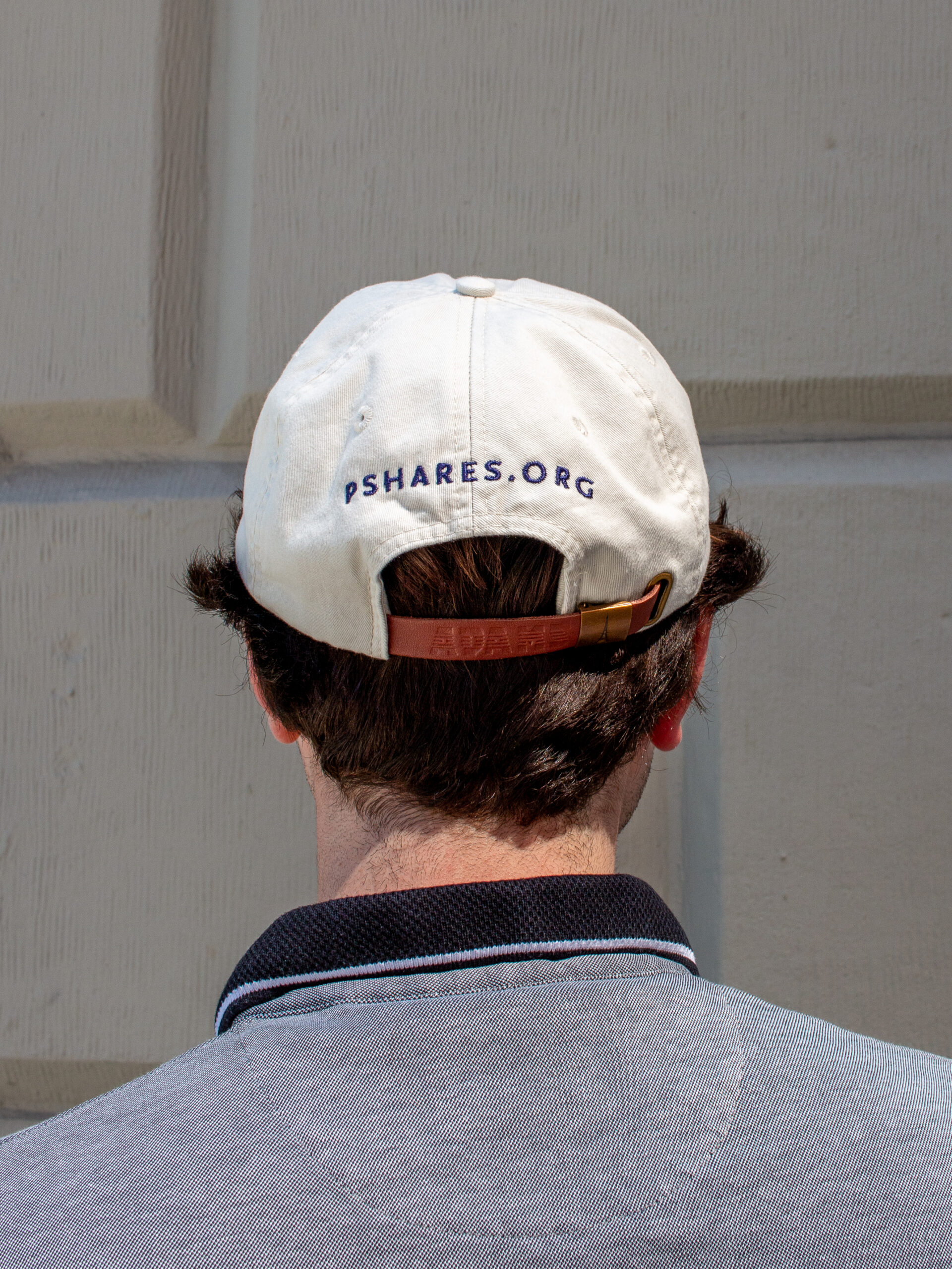 Ploughshares garment-dyed hat with a leather strap and buckle enclosure. Cream with navy embroidery. Embroidered locally by Emulsion Printhouse.